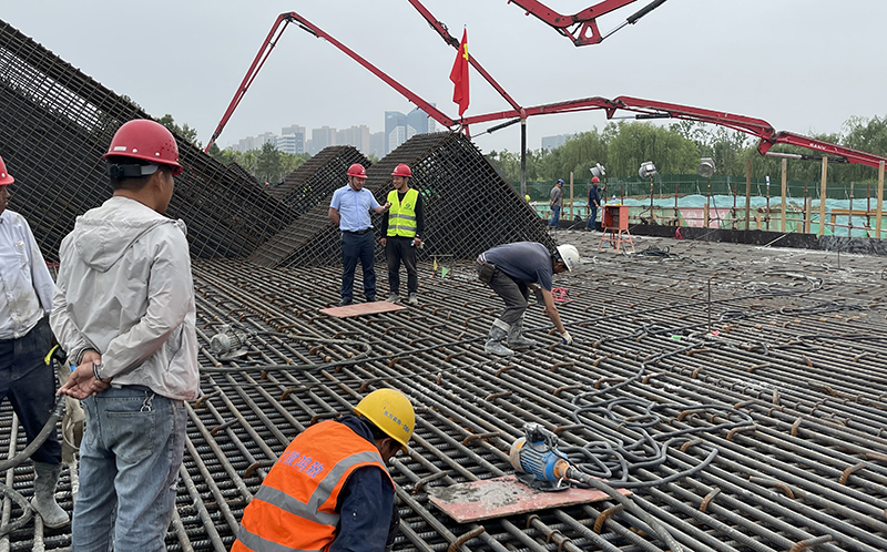 整個(gè)澆筑任務(wù)于5月11日15點(diǎn)開盤,4198m3砼不間斷澆筑,項(xiàng)目部經(jīng)營(yíng)層帶班24小時(shí)輪班駐守?,F(xiàn)場(chǎng)燈火通明、有序指揮、安全保通、送料簽單、車輛泵送、搗棒振搗、冷卻循環(huán)、測(cè)溫記錄、四周巡檢及后勤保障,各項(xiàng)工作有條不絮、如火如荼地進(jìn)行。