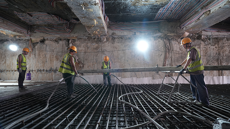 自2021年7月車(chē)站主體結(jié)構(gòu)正式進(jìn)入施工以來(lái),歷時(shí)357天完成主體結(jié)構(gòu)封頂,在面對(duì)各工程交錯(cuò)施工帶來(lái)的風(fēng)險(xiǎn)高、難度大、施工作業(yè)面狹小、地下管線眾多、施工組織復(fù)雜、工期緊等因素影響,項(xiàng)目部不等不靠,見(jiàn)縫插針,積極與各管線產(chǎn)權(quán)單位協(xié)調(diào),不斷優(yōu)化管線遷改和交通疏解方案。在前期技術(shù)準(zhǔn)備、質(zhì)量控制、安全措施和應(yīng)急預(yù)案等方面做了全面部署,多次組織專(zhuān)家進(jìn)行方案優(yōu)化論證。